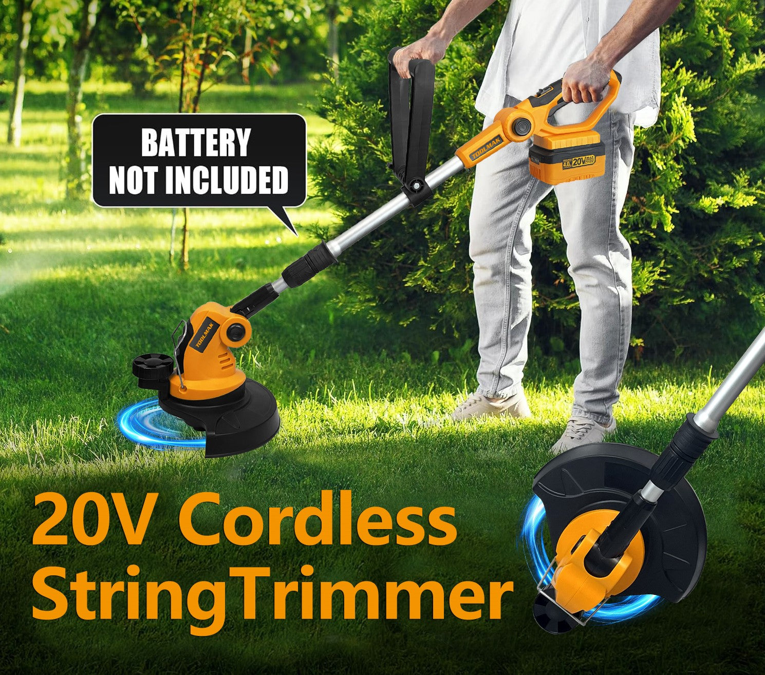 Il tagliabordi a batteria TOOLMAK unisce potenza e praticità per un taglio pulito e preciso dell’erba e dei bordi del prato.
